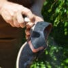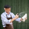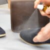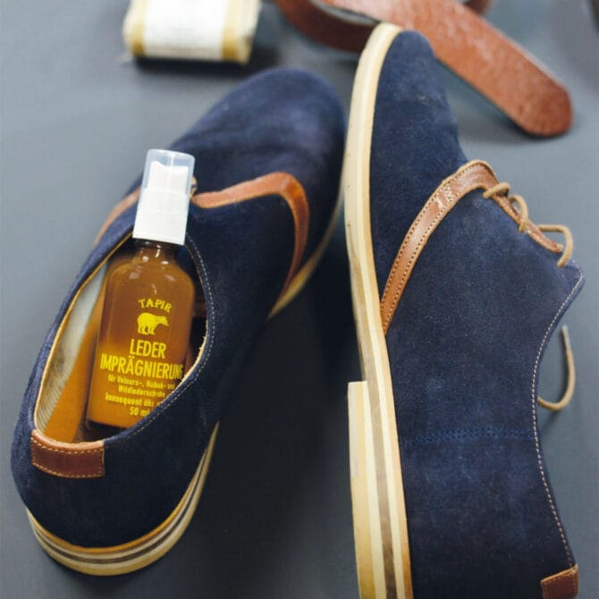 If the shoes are dirty, clean them with water and, if necessary, a mild vegetable soap before spraying. After drying, spray the leather waterproofing product onto the leather from a distance of approximately 20-30 cm. The spray pattern is not always even and will form droplets. Immediately distribute these droplets evenly over the leather using a small Tapir application brush or the Tapir polishing brush and allow them to dry briefly. Then, roughen the leather with the Tapirsuede brass brushor asuede eraser. Work in one direction.
